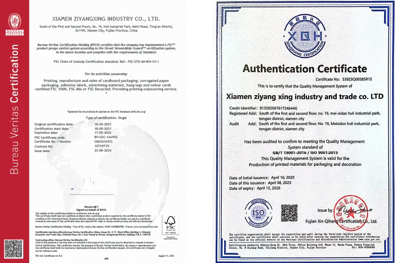 О: у нас есть сертификаты FSC, FDA, SGS, VOC и соответствие экологическим нормам, таким как RoHS, 94/62/EC и US TPCH. Наша фабрика имеет сертификат ISO9001 как ведущий международный поставщик и экспортер упаковки.